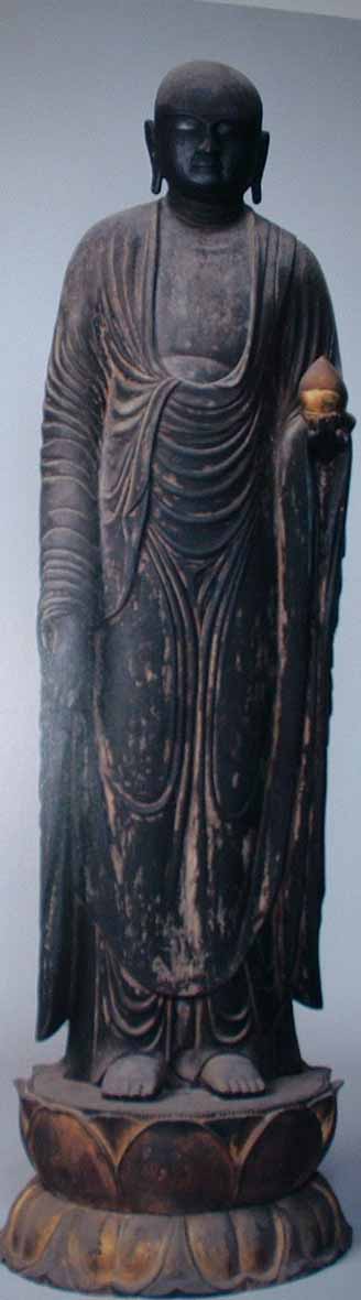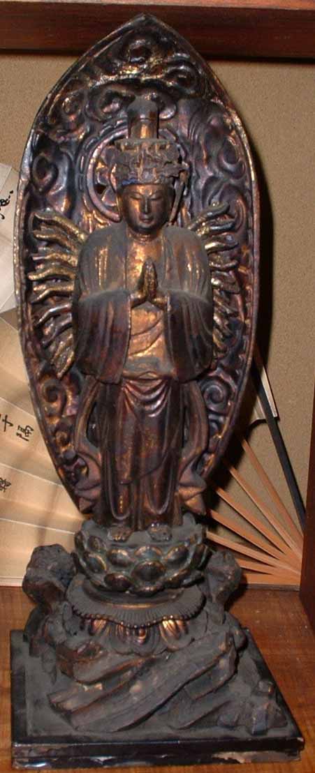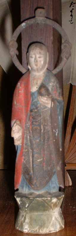 This statue (right) is a wooden Jizou from the Edo period. Just for comparison, below is a wooden Jizou exhibited at the 1986 Eikando Zenrin-ji exhibition (i.e., not part of my collection): Both are carrying the wish-fulfilling jewel. The main differences (apart from the fact that the Eikando Zenrin-ji exhibit is much larger, much older and much more valuable) are that my statue is painted and, while made of wood, has a metal halo. He stands 12 cm. (4.8 inches) high - 14 cm. (5.6 inches) with the halo - and is carved from a single piece, including the base. |